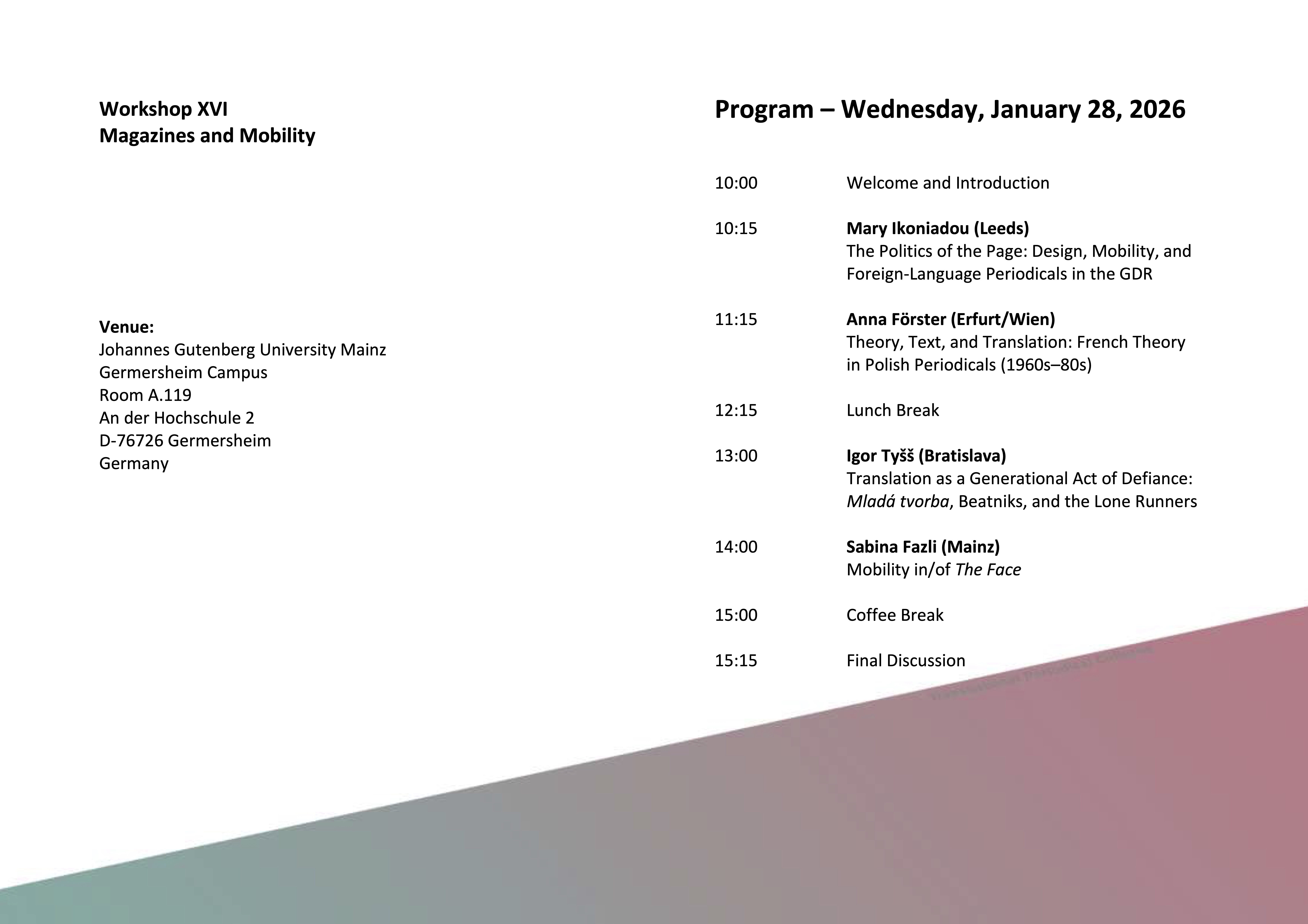Please find below the program for workshop XVI on “Magazines and Mobility”. You can download the flyer here.